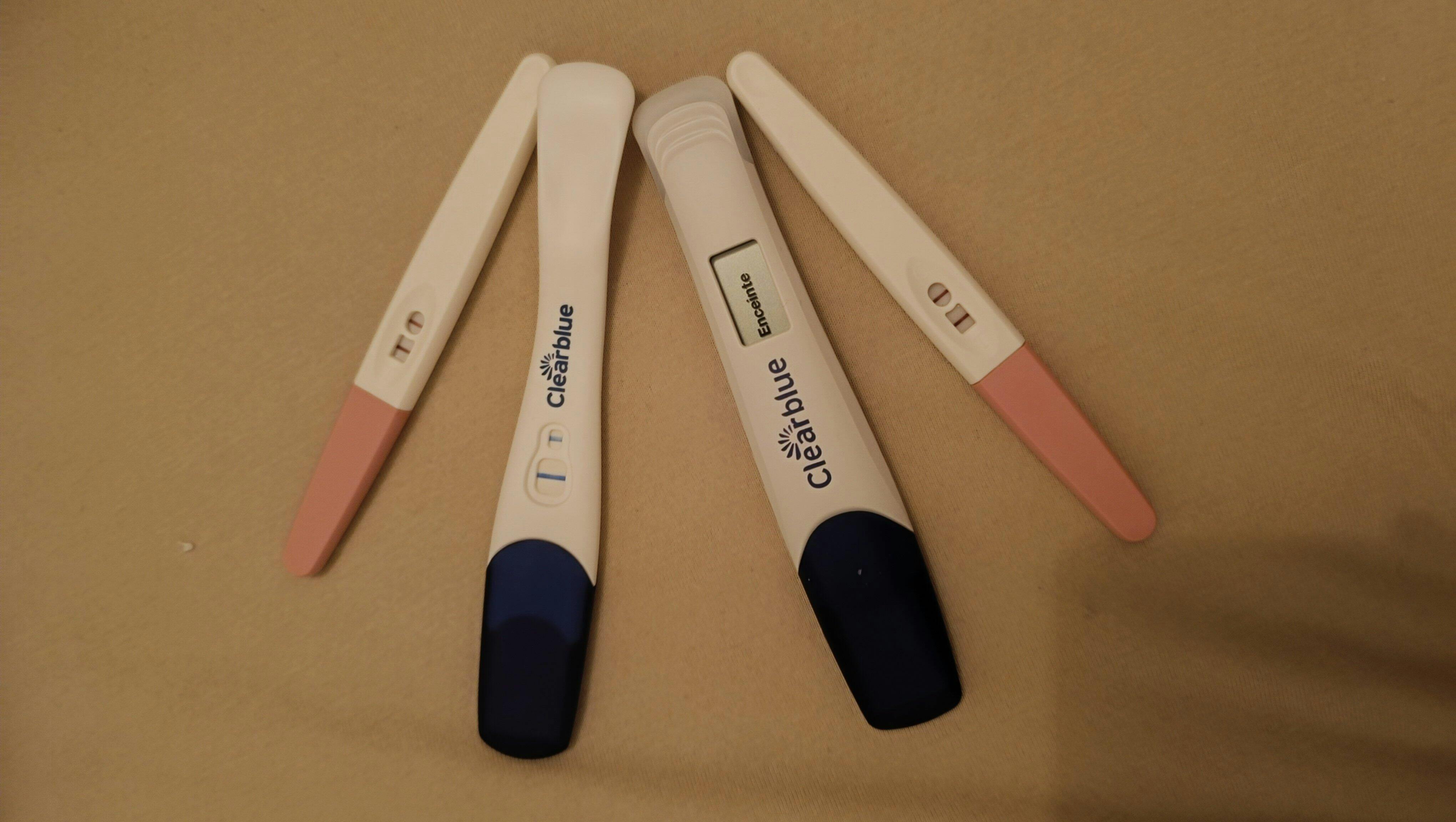 J’ai fait un test, que j’ai cru négatif. Le lendemain, une légère barre est apparue… J’ai pensé à une barre d’évaporation. Alors j’ai fait un Clearblue digital. Et là… enceinte 1–2 semaines. J’en ai refait un autre : enceinte. Le temps s’est arrêté. Sans rien dire à mon mari, je suis allée faire une prise de sang.